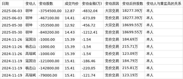 深交所公开信息显示,6月3日,康泰医学董事胡坤在竞价交易公司股票,减持股数46.71万股,成交均价14.41元,变动金额673.09万元,变动后持股数为18277.39万股。