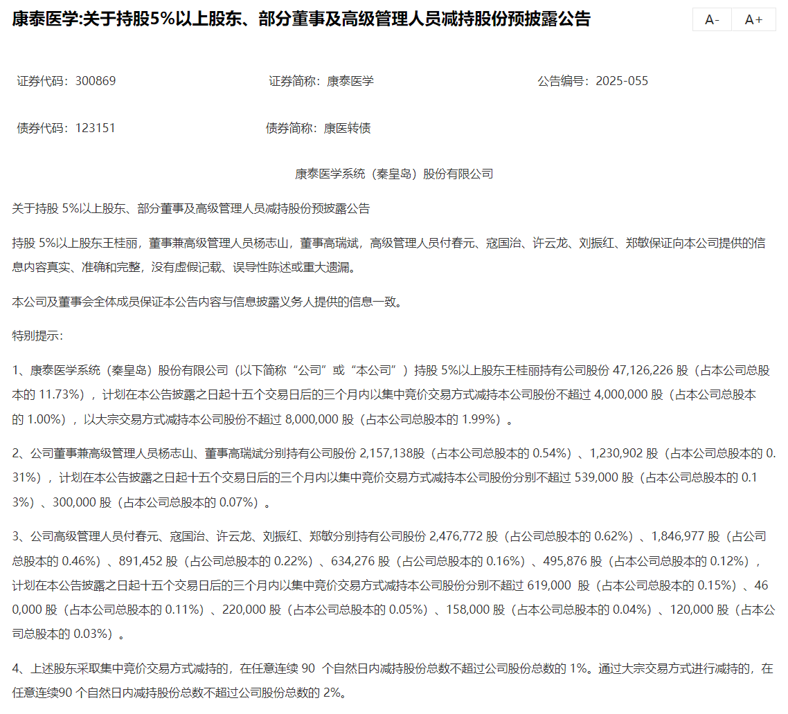 相关媒体报道显示,从2024年至今,康泰医学高管、实控人已先后完成数次减持。统计显示,2024年内,康泰医学董监高已累计减持238.9万股。2025年5月8日,公司实际控制人拟减持1200万股公司股份,占总股本的2.9865%。截至6月20日,1200万股已全数减持完毕。