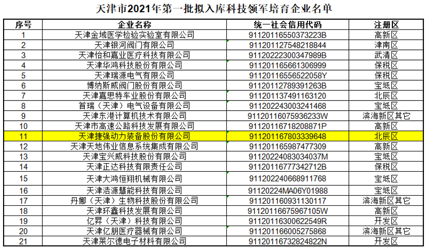 2021年8月23日,天津市科学技术局公示了天津市科技领军培育企业名单,天津捷强动力装备股份有限公司实力登榜。继2020年11月获工业和信息化部颁发的国家级专精特新“小巨人”企业认定后,这是捷强装备在不到一年时间里获得的又一项重量级资质认证。