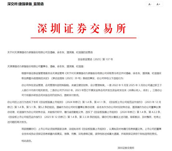 近期, 捷强装备 收到监管警示函,将公司的内控缺陷彻底暴露。11月19日晚, 捷强装备 公告称,公司收到天津证监局出具的行政监管措施决定书。公司存在资金管理、合同管理内部控制缺陷,未建立健全财务、会计管理制度。一是2022 年9 月至2025年3月公司通过职工个人银行卡代收付相关款项。二是公司于2022 年、2023 年签订不真实业务合同并发生资金收支往来(未确认收入、成本)。三是公司个别委外研发合同未按合同约定执行,提前支付款项。时任董事长、总经理潘峰、时任财务总监徐本友、公司董事长兼总经理潘淇靖、财务总监纪滋强被出具警示函。