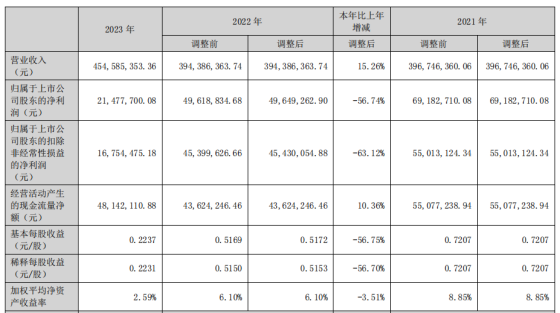 近日,蒙泰高新发布2023年报。2023年,公司实现营收4.55亿元,同比上升15.26%;归属于上市公司股东的净利润2147.77万元,同比下降56.74%;扣非净利润1675.45万元,同比下滑63.12%。