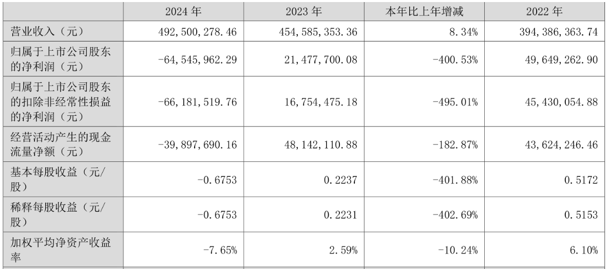 2024年,蒙泰高新实现营业收入4.93亿元,同比增长8.34%;归属于上市公司股东的净利润为-6,454.60万元,上年同期为2,147.77万元;归属于上市公司股东的扣除非经常性损益的净利润为-6,618.15万元,上年同期为1,675.45万元;经营活动产生的现金流量净额为-3,989.77万元,上年同期为4,814.21万元。