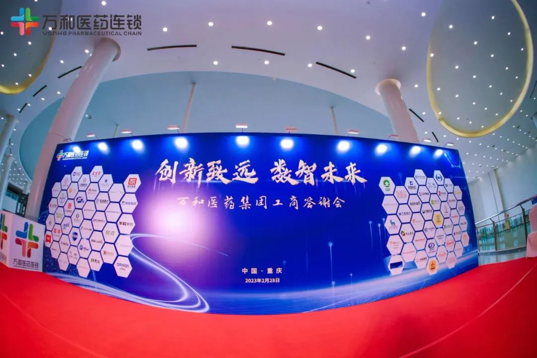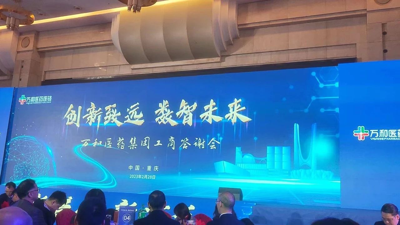 2023年2月28日,万和医药集团工商答谢盛典在南坪会展中心大宴会厅拉开帷幕。万和医药集团董事长唐先伟,总经理周娅,运营中心总监何卓家,商采中心总监单鹏,处方事业部总监李小江,市场中心总监吴旭,维康药业零售事业部副总经理熊赓,重庆省区经理毛矛等领导共同参会。