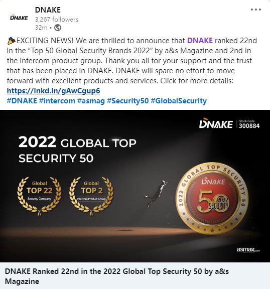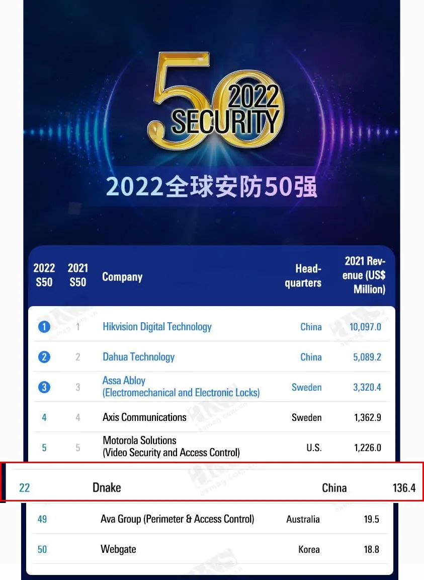 日前,全球知名科技媒体a s《安全自动化》发布2022年“全球安防50强”企业排行榜单,狄耐克跃居第22位,参选Intercom企业中位列第2名,首次跻身全球安防50强企业行列。