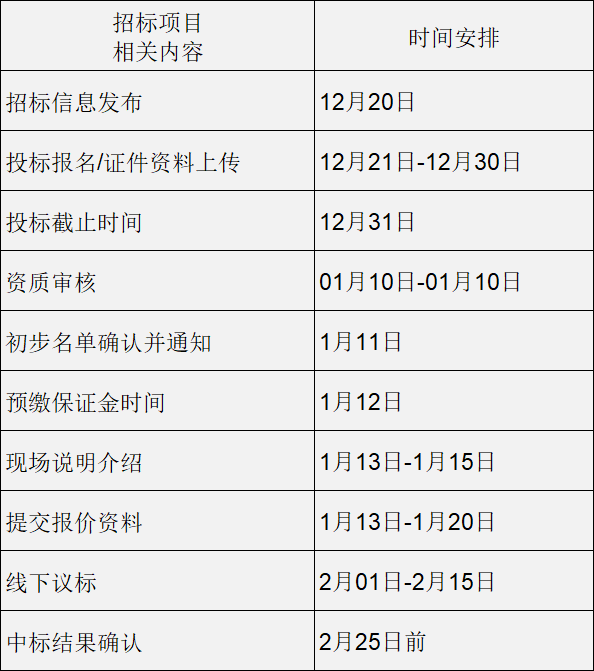 2、招标流程介绍:投标方信息招标公告→竞标方平台报名线下报名→竞标公司资料审核(邮件发送+纸质原件签封)→初步名单确认并通知→投标保证金缴纳→线下介绍会→提交报价等相关材料→线下议标→中标结果通知