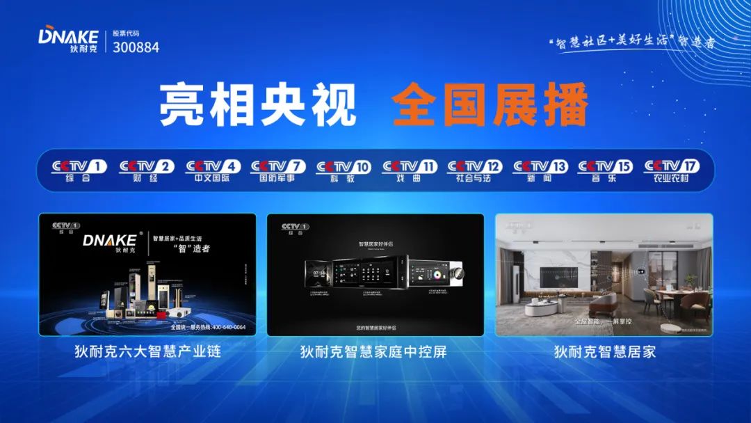 2023年8月起,狄耐克4-12吋智慧家庭中控屏在央视CCTV-1综合频道、CCTV-2财经频道、CCTV-4中文国际频道、CCTV-7国防军事频道、CCTV-10科教频道、CCTV-11戏曲频道、CCTV-12社会与法频道、CCTV-13新闻频道、CCTV-15音乐频道、CCTV-17农业农村频道等十大频道中陆续亮相,进行为期三个月的多台联动,全国展播!