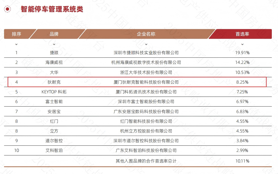 在智能停车管理系统TOP榜单评选中, 狄耐克 位列第四名。