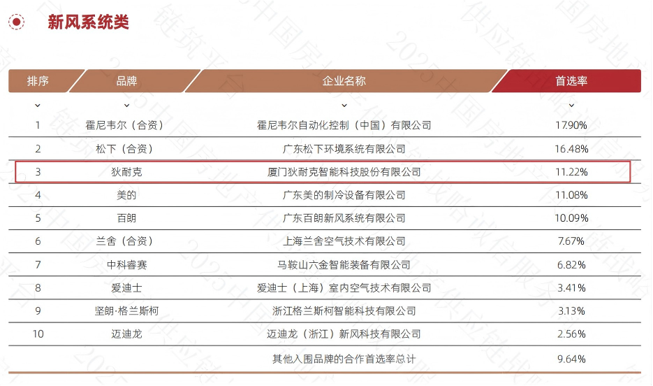狄耐克 以11.22%的首选率位列新风系统类榜单第三名。