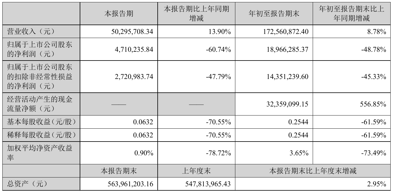 10月27日,华业香料(300886)近日发布2021年前三季度报告,报告期内营业收入172,560,872.40元,同比增加8.78%;净利18,966,285.37元,同比净利减少48.78%。