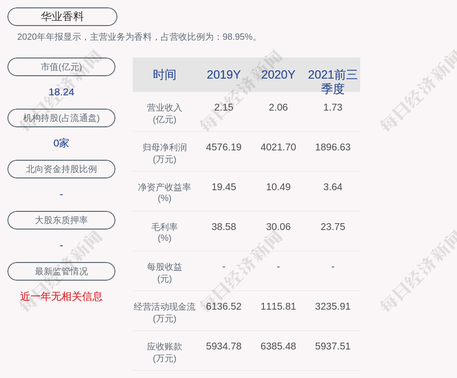 2020年年报显示,华业香料的主营业务为香料,占营收比例为:98.95%。