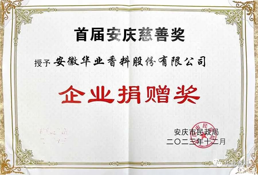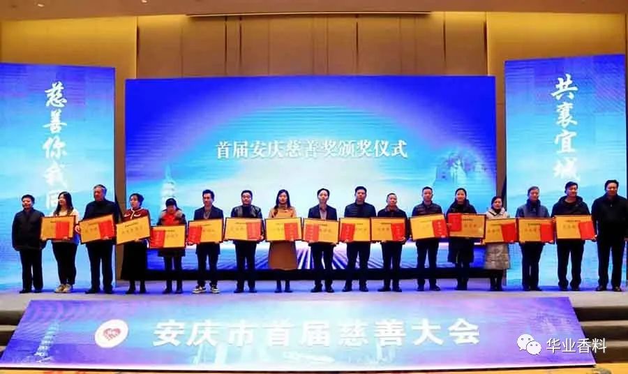 12月18日,安庆市首届慈善大会隆重召开。本次活动由安庆市民政局主办,市慈善总会和市新闻传媒中心承办。在此次大会上,华业香料荣获企业捐赠奖。