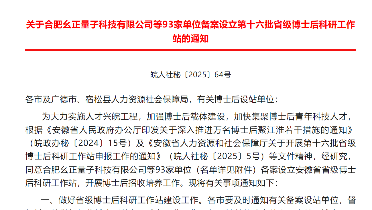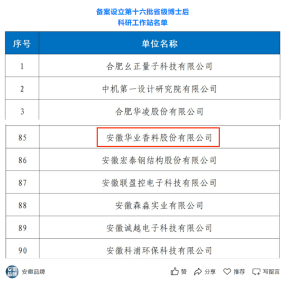 近日,经安徽省人力资源和社会保障厅审核批准(皖人社秘〔2025〕64号),安徽华业香料股份有限公司获批设立安徽省博士后科研工作站。该平台的获批,标志着公司在产学研协同创新体系建设和高层次人才培养方面取得新进展。