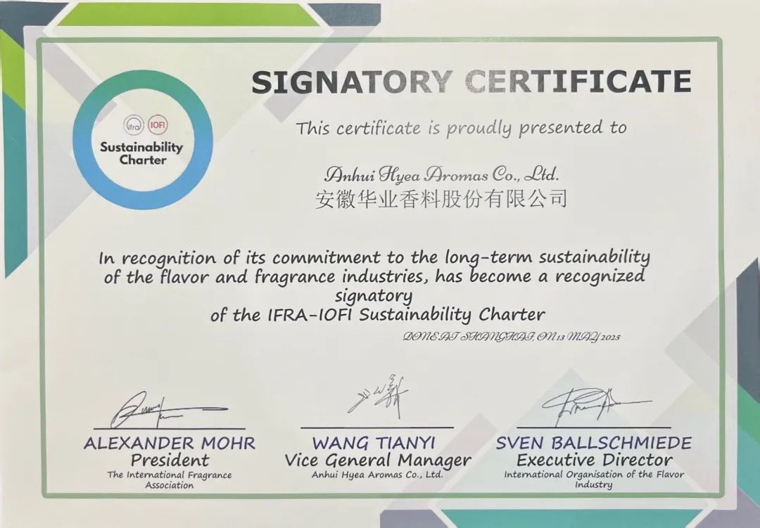 2025年5月13日,由中国香料香精化妆品工业协会(简称:中国香妆协会,CAFFCI)与国际日用香料协会(IFRA)、国际食品用香料工业组织(IOFI)共同主办的国际香料香精可持续发展研讨会,在上海成功举行。在此次会议上,包含华业香料在内的四家中国企业共同加入《IFRA-IOFI联合可持续章程》,实现了中国香料香精行业企业在成功加入IFRA-IOFI联合可持续章程方面“零的突破”。