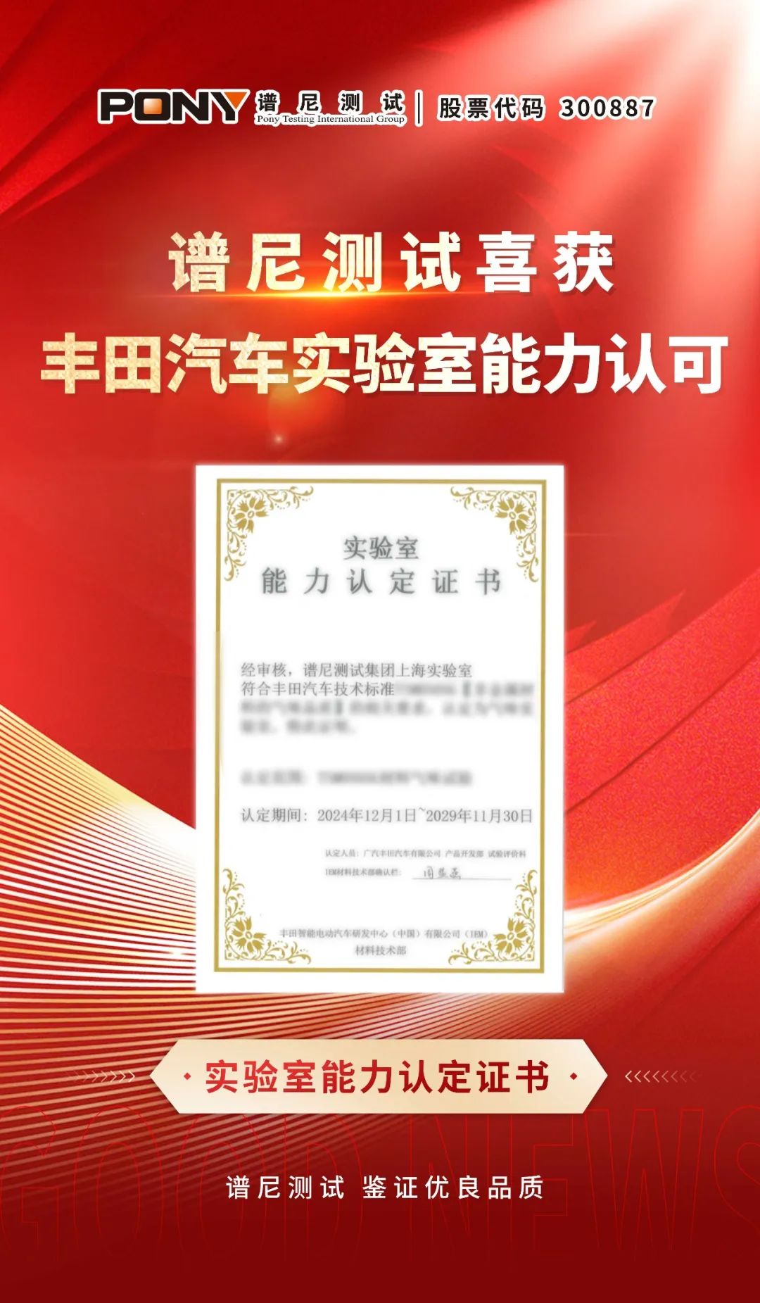 近日,PONY谱尼测试顺利通过丰田汽车气味测试的审核要求与能力验证,正式获得丰田汽车气味实验室认可证书。