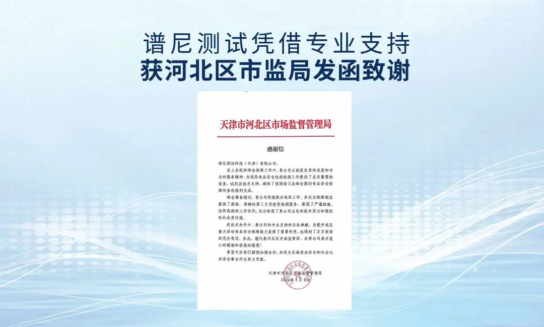 峰会结束后,谱尼测试天津公司收到天津市河北区市场监督管理局发来的感谢信,对公司在食品安全保障工作中所给予的重要支持和贡献表示高度认可。
