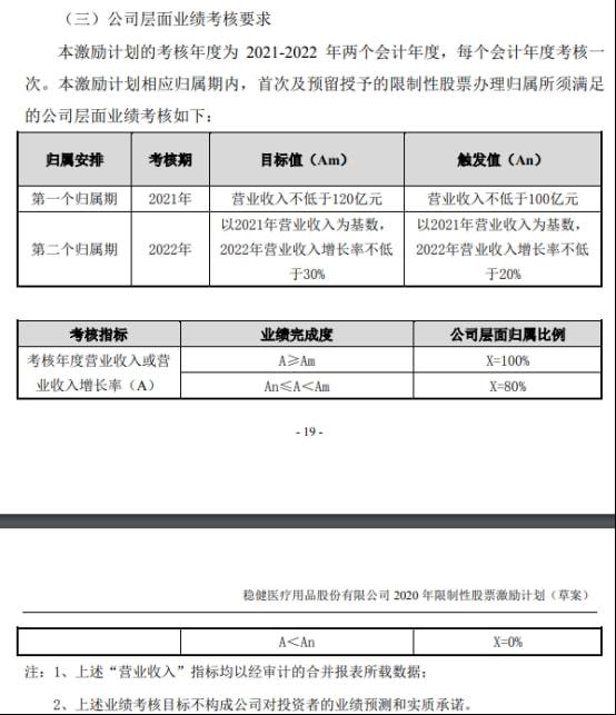 2020年11月29日,稳健医疗发布《2020年限制性股票激励计划(草案)》,该激励计划的考核年度为2021-2022年两个会计年度,每个会计年度考核一次。