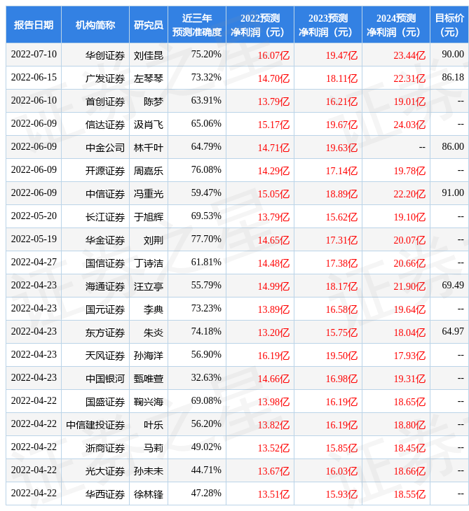 数据中心根据近三年发布的研报数据计算,华金证券刘荆研究员团队对该股研究较为深入,近三年预测准确度均值为77.7%,其预测2022年度归属净利润为盈利14.65亿,根据现价换算的预测PE为21.34。