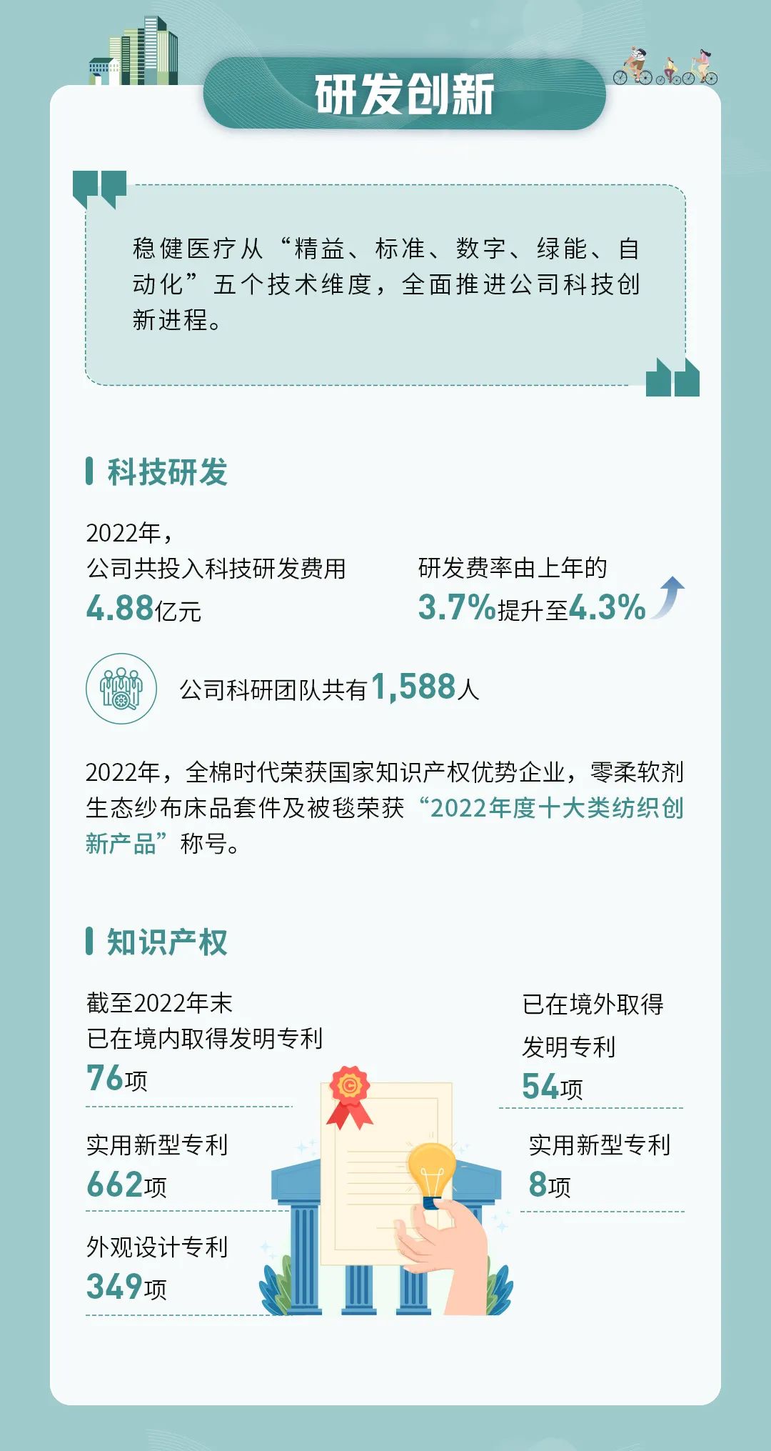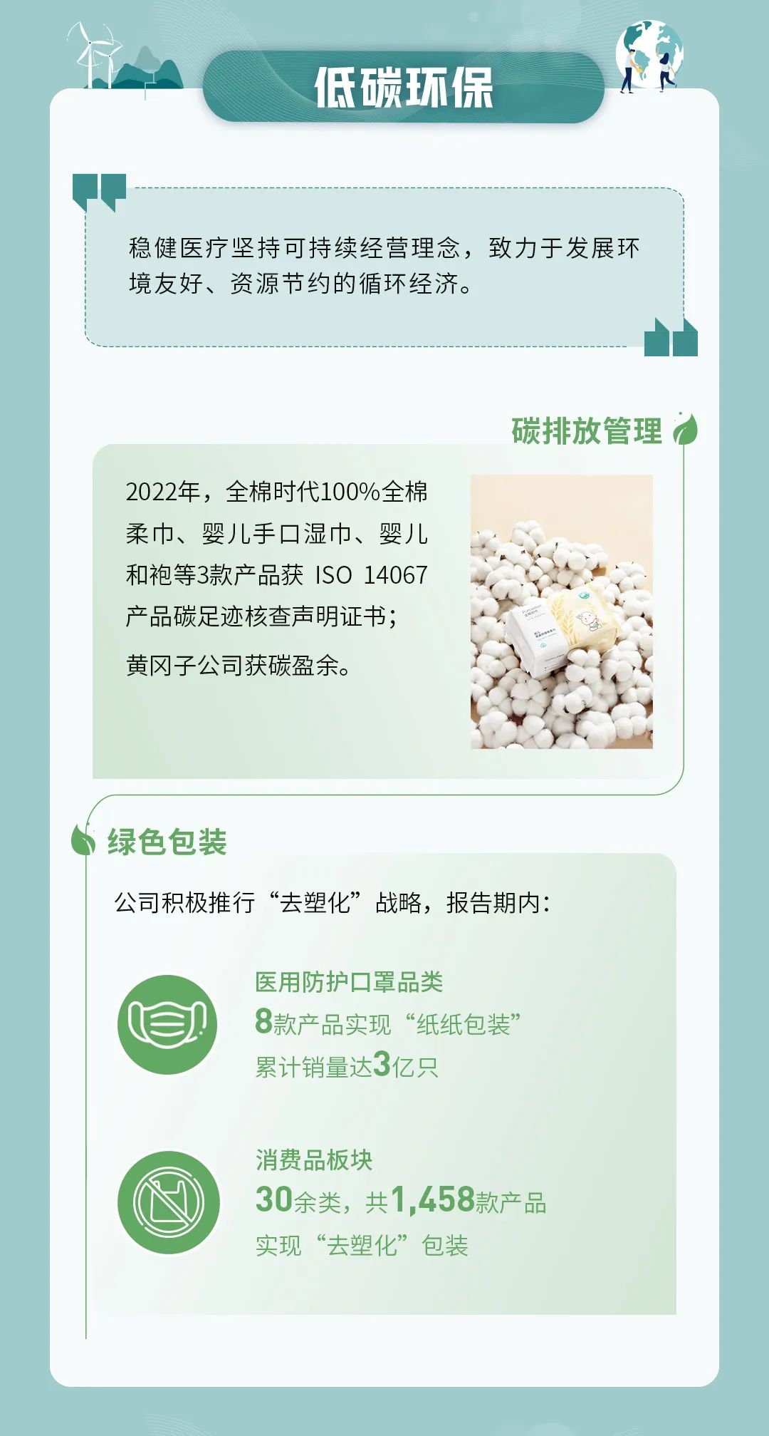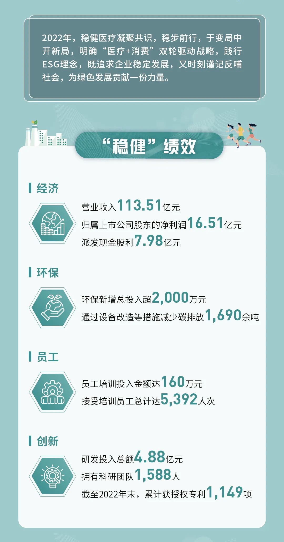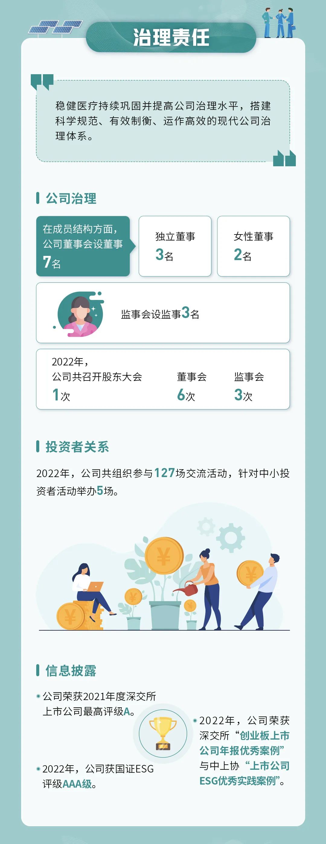 本年度ESG报告在详细说明稳健医疗对于环境、社会、公司治理相关事宜的监督、评估及管理流程的同时,全面展现了公司2022年在助力医疗普惠、打造绿色工厂、坚持负责任营销、筑造低碳供应链、保障员工健康安全等领域的重要进展与主要成绩。