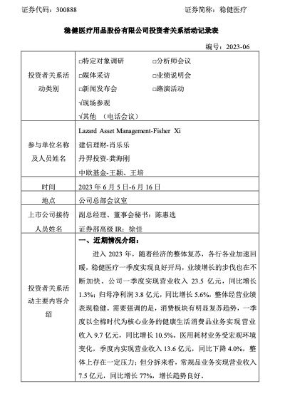 稳健医疗用品股份有限公司(以下简称“稳健医疗”或“公司”)6月20日发布公告称,公司于近期接受了多家机构投资者的现场参观并进行了电话会议。在活动中,稳健医疗透露,公司一季度实现营业收入23.5亿元,同比增长1.3%;归母净利润3.8亿元,同比增长5.6%,整体经营业绩表现稳健。