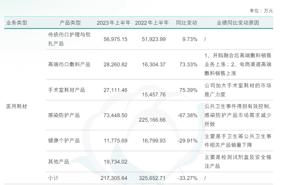 今年上半年,稳健医疗的医用耗材板块实现收入21.73亿元,同比下降33.27%,其中,感染防护产品的收入从2022年上半年的22.52亿元骤降至7.34亿元。对此,稳健医疗方面直言,是“公共卫生事件得到有效控制,感染防护产品市场需求减少所致”。