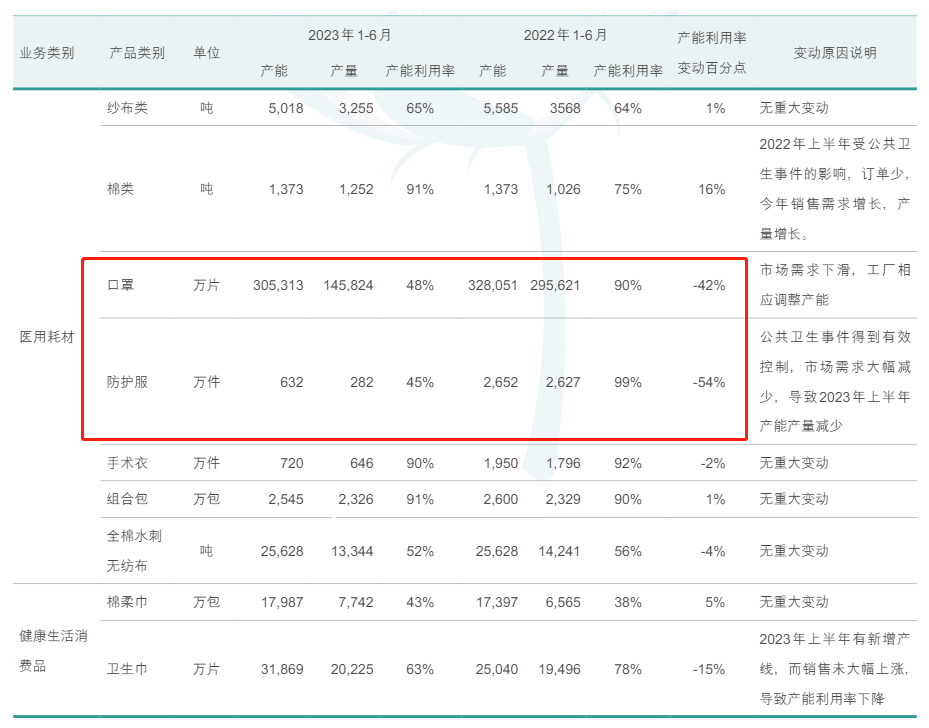 值得一提的是,市场需求的下降,或让稳健医疗大量的产能闲置。财报显示,今年上半年,公司的口罩产量为14.58亿片,产能利用率为48%,上年同期则为90%;公司防护服产量为282万件,产能利用率由99%下降至45%。