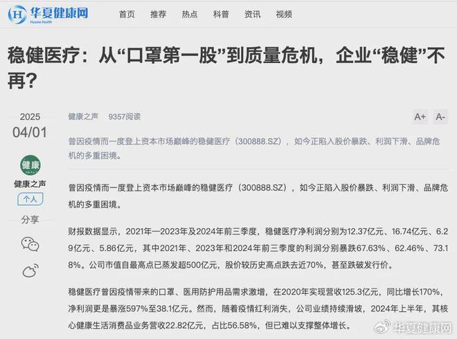从“口罩第一股”到“品牌信任危机”的主角,稳健医疗的高光时刻已然过去。疫情红利的消退暴露出其主营业务的脆弱性,而卫生巾翻新丑闻、产品质量问题、监管处罚、股东减持等多重危机,使其未来发展更加充满不确定性。
