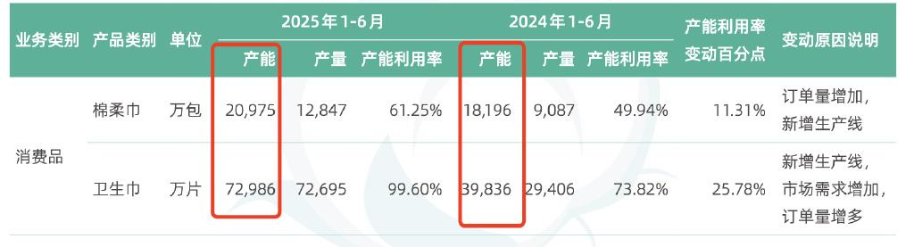 从产能来说,2024年上半年,全棉时代卫生巾业务的产能不到4亿片,而到了2025年则直接超过7亿片,同比涨幅超80%。近年来,稳健医疗的棉柔巾产能利用率均不到50%(2025年上半年为61.25%),而卫生巾生产线却一直保持在80%以上,产能不足后卫生巾产线连年扩产,公司卫生巾2025年上半年产能利用率更是提升到99.6%,生产线爆满。