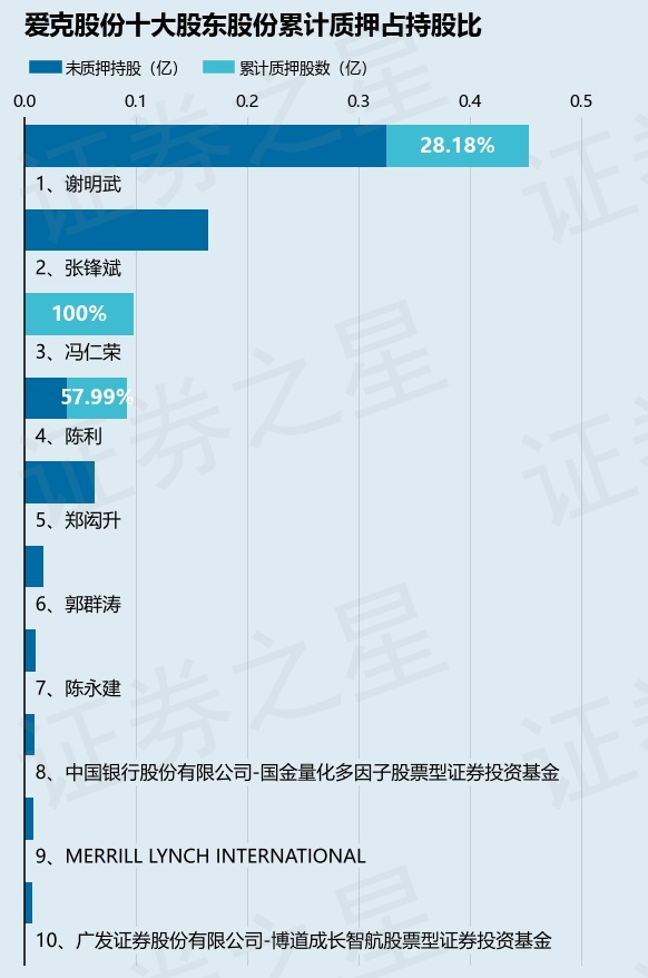 截止本公告日,股东谢明武已累计质押股份1277.5万股,占其持股总数的28.18%,股东冯仁荣已累计质押股份982.5万股,占其持股总数的100.0%,股东陈利已累计质押股份535.0万股,占其持股总数的57.99%。本次质押后爱克股份十大股东的累计质押股份占持股比例见下图: