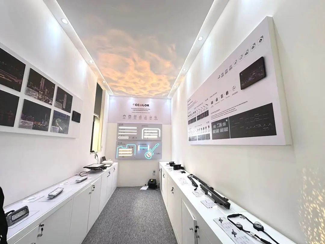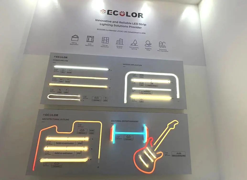 爱克股份深入家具配套、室内勾勒、文化娱乐及楼宇亮化等多种场景需求,推出具有智能、高防护、全彩等特点的一站式产品解决方案,现场展出SMD裸灯带、CSP裸灯带、SMD硅胶灯带、CSP硅胶灯带等特色产品。