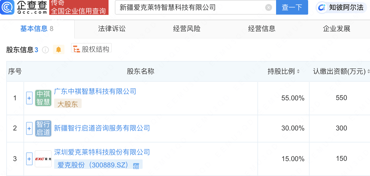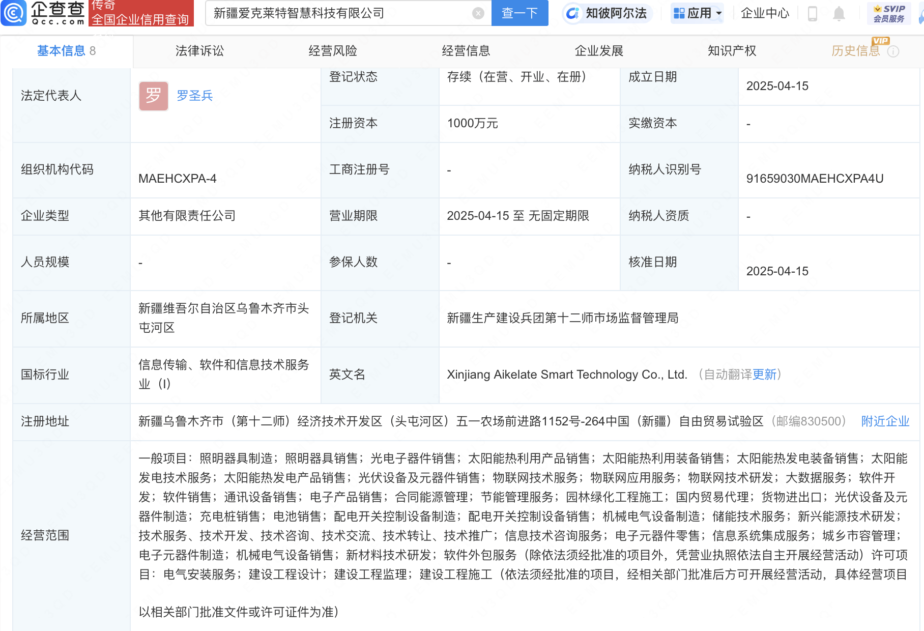 企查查APP显示,近日,新疆爱克莱特智慧科技有限公司成立,法定代表人为罗圣兵,注册资本1000万元,经营范围包含:物联网技术服务;物联网应用服务;物联网技术研发;大数据服务等。企查查股权穿透显示,该公司由爱克股份(300889)等共同持股。