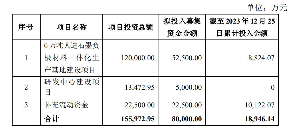 2024年1月9日,翔丰华公告对部分募投项目计划的调整,将“6万吨人造石墨负极材料一体化生产基地建设项目”达到预定可使用状态的时间由2023年12月调整至2025年12月。从募集资金的使用情况来看,该项目截至2023年12月25日仅投入8824.07万元。