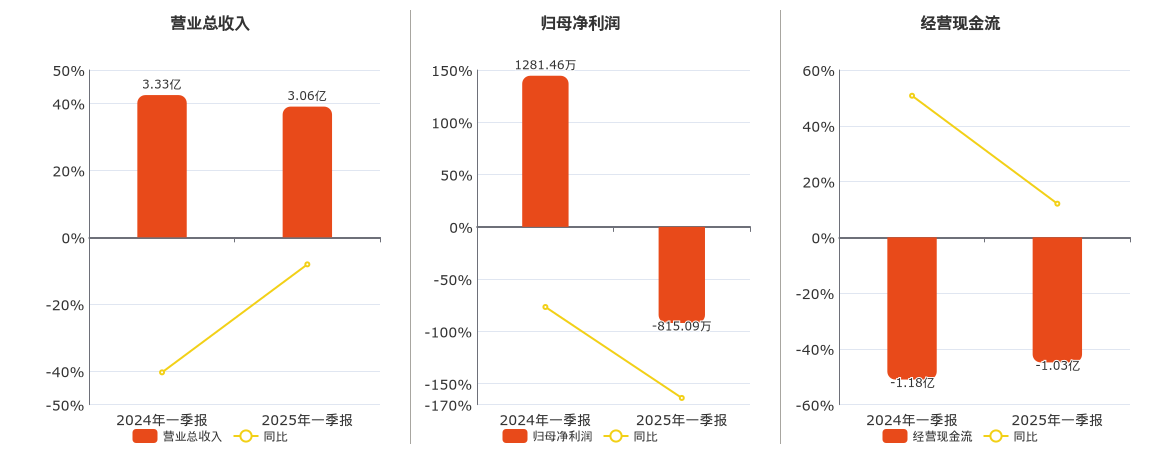 公司营业总收入为3.06亿元,较去年同报告期营业总收入减少2689.19万元,同比较去年同期下降8.08%。归母净利润为-815.09万元,较去年同报告期归母净利润减少2096.55万元,同比较去年同期下降163.61%。经营活动现金净流入为-1.03亿元。