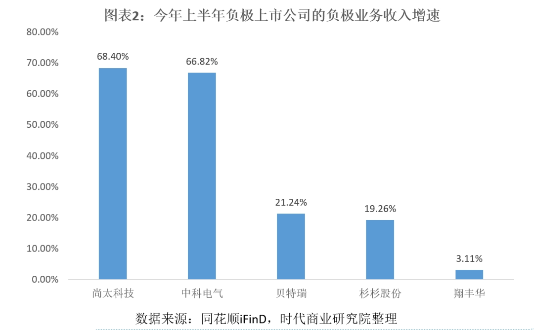 更值得注意的是,四家头部企业负极业务的收入仍保持较高增速。今年上半年,贝特瑞、杉杉股份、中科电气、尚太科技负极业务的收入同比增速分别为21.24%、19.26%、66.82%、68.4%。其中,中科电气、尚太科技增速亮眼;而同期翔丰华负极业务的收入同比减少3.11%。