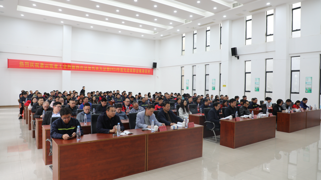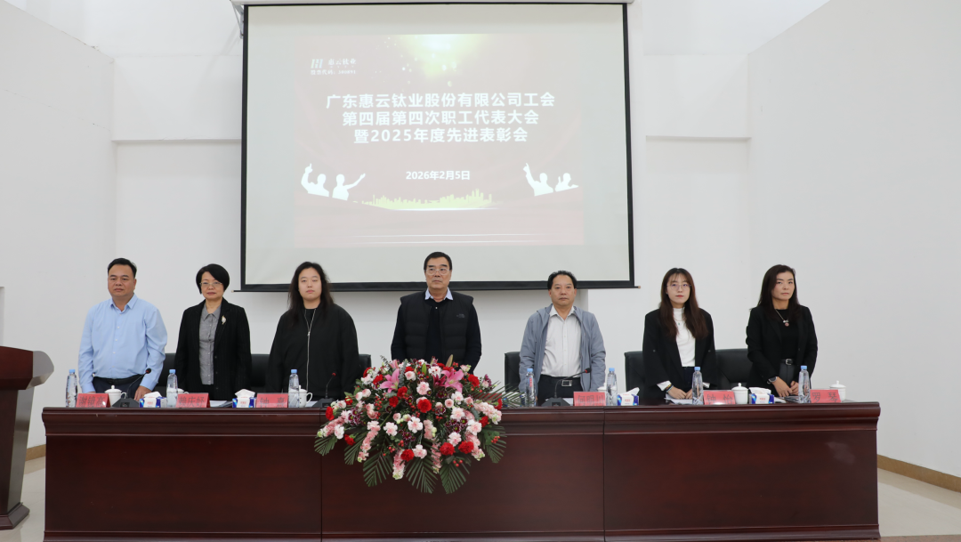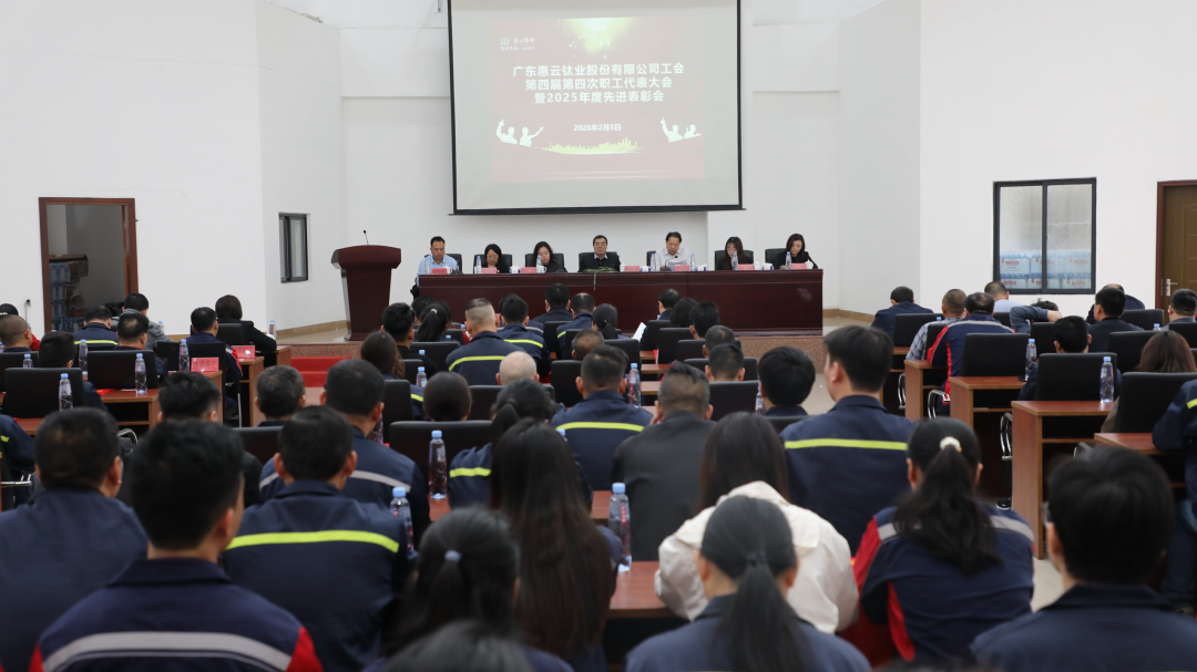 2月5日下午,广东惠云钛业股份有限公司工会第四届委员会第四次会员代表大会暨2025年度先进表彰会在公司大会议室隆重召开。公司董事长钟镇光,总经理何明川,副董事长兼副总经理钟熹,副总经理赖庆妤,副总经理兼董事会秘书钟怡,财务总监罗琴等领导班子成员,工会会员代表、获奖集体及个人代表共计154人齐聚一堂,共商公司发展大计,表彰先进树立标杆。
