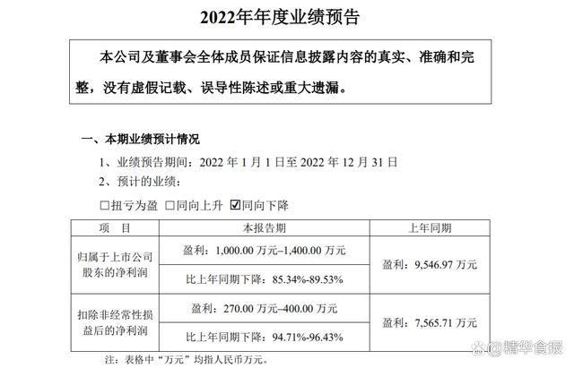 2020年在创业板挂牌交易的品渥食品前近日再次交出一份令人大跌眼镜的业绩预告单,公司预计2022年净利润1000万-1400万,比上年同期的9547.97万元下滑85.34%-89.53%。扣非净利润270万-400万,同比上年同期的7565.71万元下滑94.71%-96.43%。