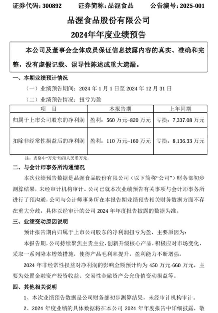 《快消品》了解到,品渥食品还预估其扣除非经常性损益后的净利润将在110万元至160万元之间,这与去年同期的亏损8136.33万元形成了鲜明对比。公司方面指出,此次业绩改善主要得益于几个关键因素:首先是对主营业务的持续专注以及核心产品的创新升级;其次是通过一系列降本增效措施提高了产品毛利率;最后,处置金融资产所带来的投资收益及交易性金融资产公允价值变动损益等非经常性损益也对净利润产生了正面影响,这部分金额预计约为450万元至660万元。
