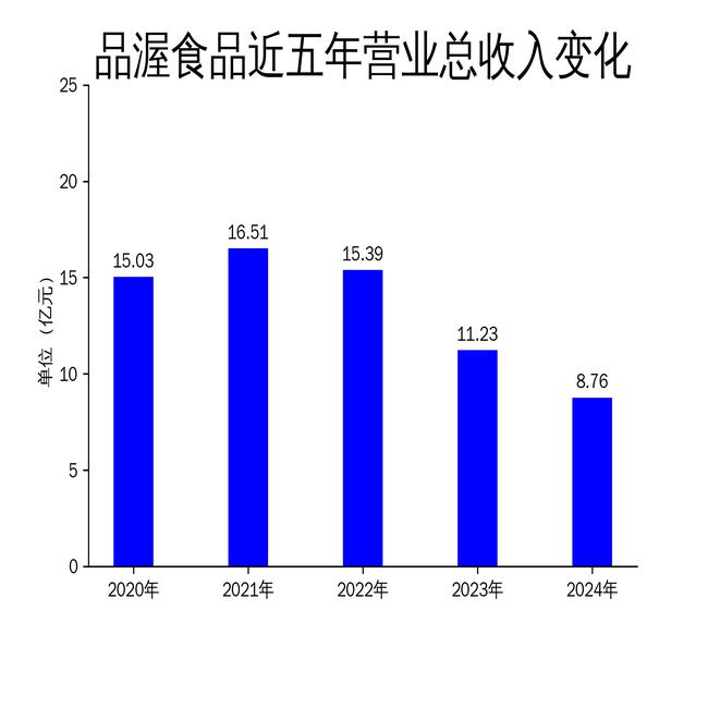 品渥食品2024年营收同比下降21.98%,这是自2020年以来首次跌破10亿元大关。尽管公司在2023年已经出现了27%的营收下滑,但2024年的表现进一步加剧了市场对其业务增长乏力的担忧。从历史数据来看,品渥食品的营收在2020年达到15.03亿元,2021年增长至16.51亿元,但此后逐年下滑,2022年和2023年分别降至15.39亿元和11.23亿元。2024年的8.76亿元营收,显示出公司在市场竞争中的疲软态势。