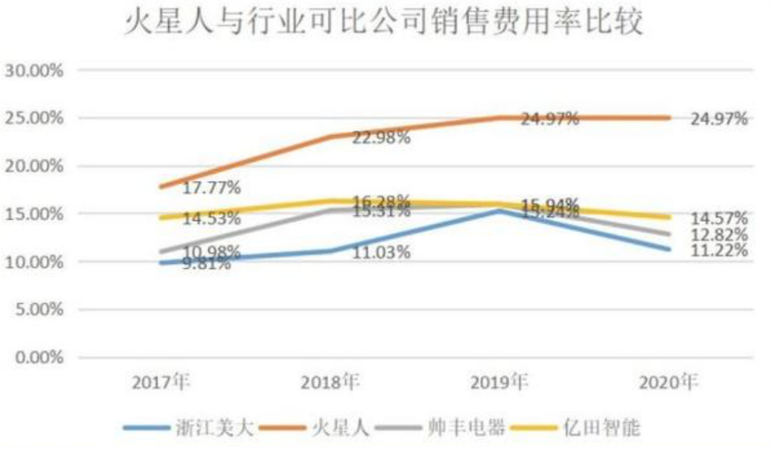 从曲线图可以看出,2019年-2020年,当同行业销售费用率均在下调时,仅火星人销售费用率仍在上涨,比第二名亿田智能高出10个百分点,是浙江美大的2倍左右。