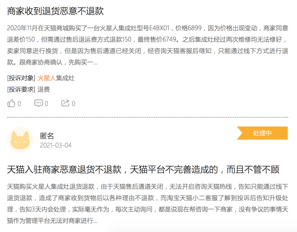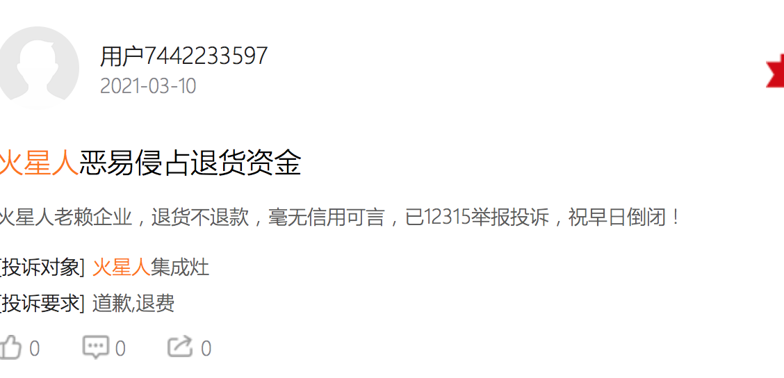 网友“桃子姐1016”则投诉称,火星人集成灶违背售后承诺,其处于对火星人的品牌信任购买产品,但收到货后,商家所承诺的售后服务不予兑现且投诉不予回复。