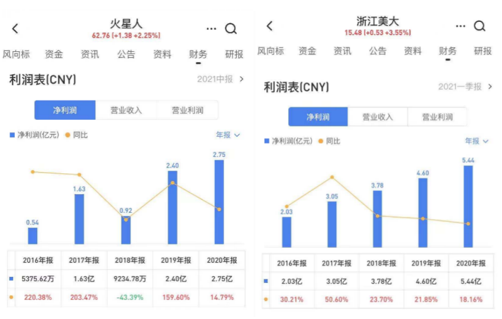 数据显示,2016年-2020年,火星人净利润分别为5375.62万元、1.63亿元、9234.78万元、2.4亿元和2.75亿元。同期,浙江美大净利润分别为2.03亿元、3.05亿元、3.78亿元、4.6亿元和5.44亿元。