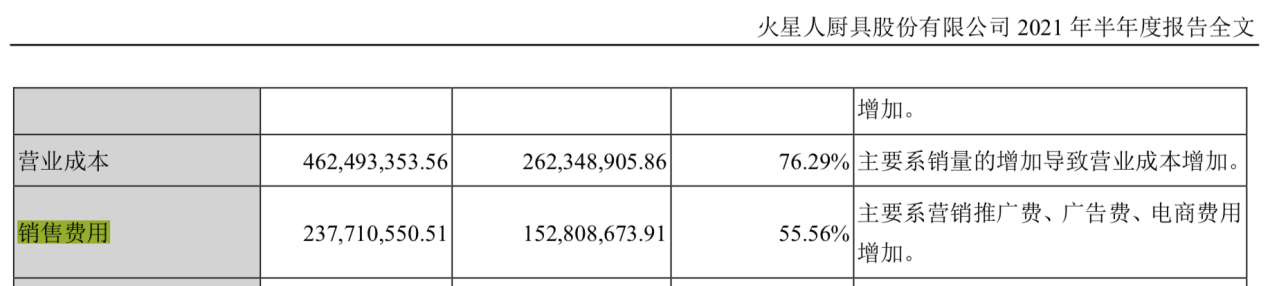 据最新披露的半年报显示,2021年上半年火星人销售费用依旧处于高位,仅半年销售费用达2.38亿元,同比大幅增长55.56%。对此火星人解释称,主要系营销推广费、广告费和电商费用的增加。