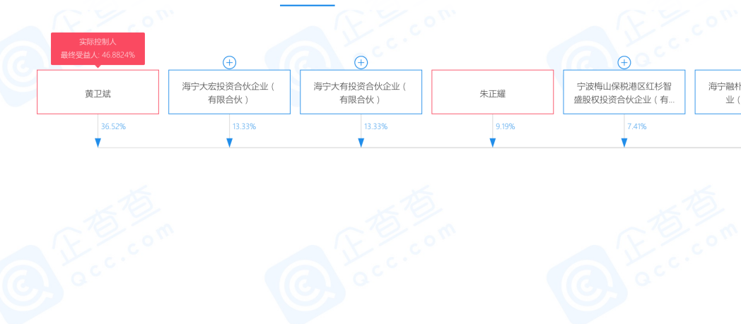 企查查数据显示,目前火星人第一大股东为创始人黄卫斌,其直接持股36.52%,此外他还通过担任火星人第二、三大股东海宁大有和海宁大宏(公司员工持股平台)的执行事务合伙人,分别持股44.4667%和46.8824%,最终合计持有火星人36.52%股权,是公司的实际控制人和最终受益人。