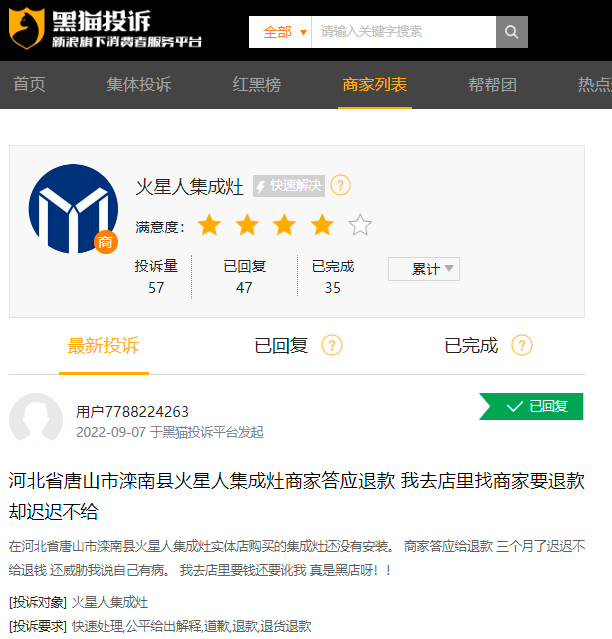 其次,火星人也面临口碑信誉下滑的尴尬境地。「探客深科技」注意到,在黑猫投诉平台上,涉及火星人的投诉合计达到57条,而网友们对火星人的投诉主要为产品质量差、售后服务差、虚假宣传、不发货与退款难等。