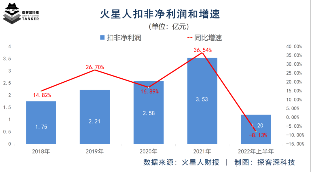 即便到了今年,火星人的营收依然在增长。最新半年报显示,2022年上半年该公司营收为10.23亿元,同增10.99%。