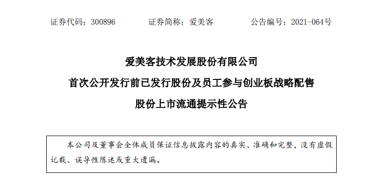9月24日,爱美客发公告披露,首次公开发行的有限售条件股份及其因2020年度资本公积金转增股本(10股转增 8股)增加的股份,共计54,729,828股,限售期为12个月,即将解禁。
