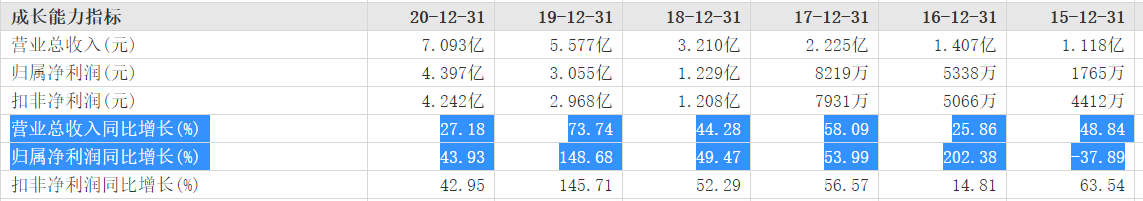 据东方财富网统计的历年财报数据显示,2015—2020年,爱美客的营收增速分别为48.84%、25.86%、58.09%、44.23%、73.74%和27.18%。