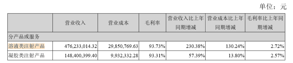 今年上半年,爱美客的溶液类注射产品营收占其总营收的比例高达75.2%。相比以往,其对该类产品的依赖程度更高了。