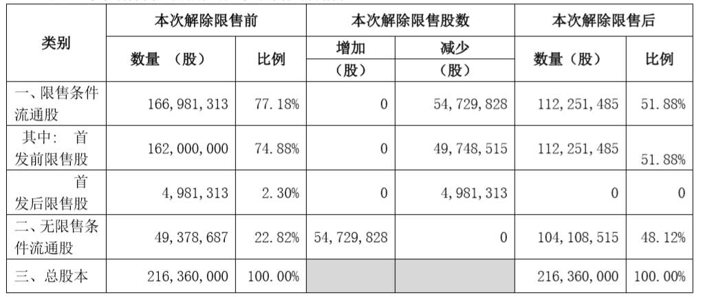 本次爱美客首发前限售股解禁后,其限售条件流通股占比51.88%,无限售条件流通股占比提升至48.12%。