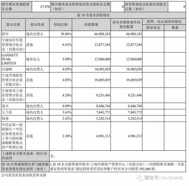 截至2020年6月30日,简军持股为30.96%,宁波知行军投资管理合伙企业(有限合伙)持股为6.41%,GANNET TPEAKLIMITED持股为5.99%,石毅峰持股为4.85%。