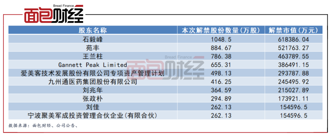 Gannett Peak Limited目前是爱美客第三大股东,值得注意的是,其要减持的这部分股权节前才获得解禁。9月29日,爱美客共解禁5472.98万股,市值总计达322.79亿元,其中Gannett Peak共解禁655.31万股。